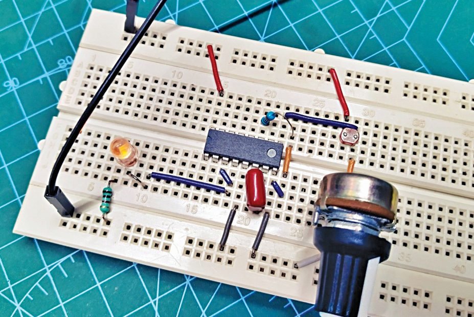 This project uses an odd approach to design and build a hobby-level VFC module using a handful of easily available and inexpensive electronic components. Author’s circuit of the VFC module wired on a breadboard is shown in Fig. 2.